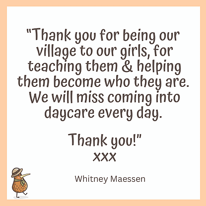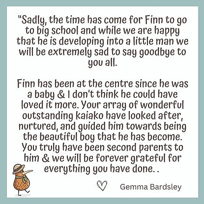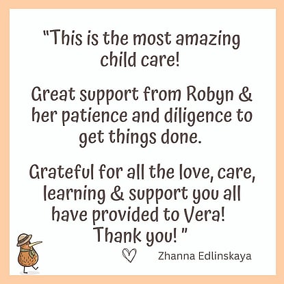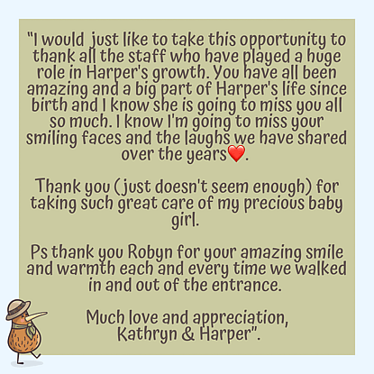 As parents, we truly valued and appreciated the personal touch that you provided. Being greeted by name and having regular discussions about Sam's developments were not just part of a curriculum but a genuine part of the everyday interactions. This personalised approach is something we value because, in our opinion, daycare is the foundation for many of life's learning opportunities. The relationship a child builds with their learning institution during this crucial phase plays a vital role in shaping their lifelong approach to knowledge, learning, and development. To be included on this journey even when not there to see it is gold.