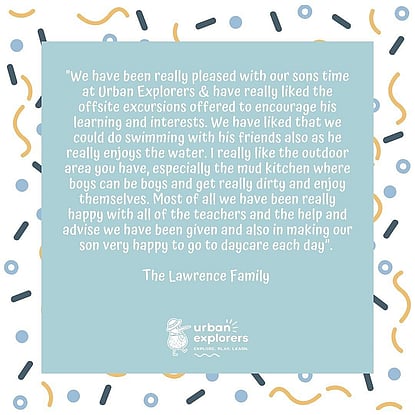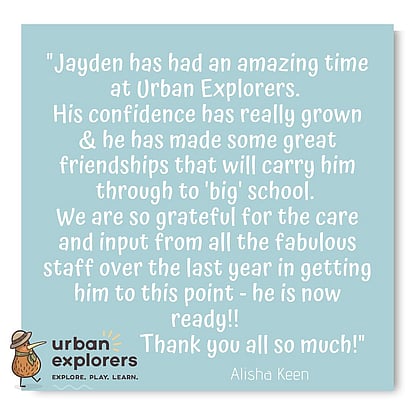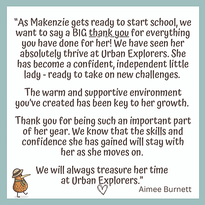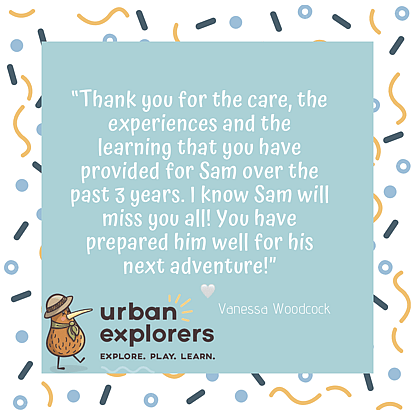 As Sam prepares to take his first steps into formal education, I wanted to take a moment to express our gratitude for the wonderful experience he has had at Urban Explorers. Unlike many children Sam has attended 3 different centres -each different, and each 'fit for purpose' regarding his stage in life and our location.
