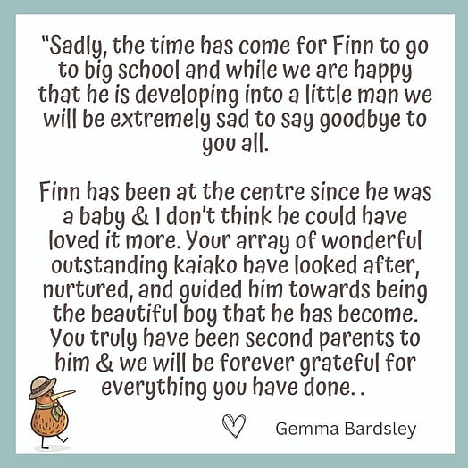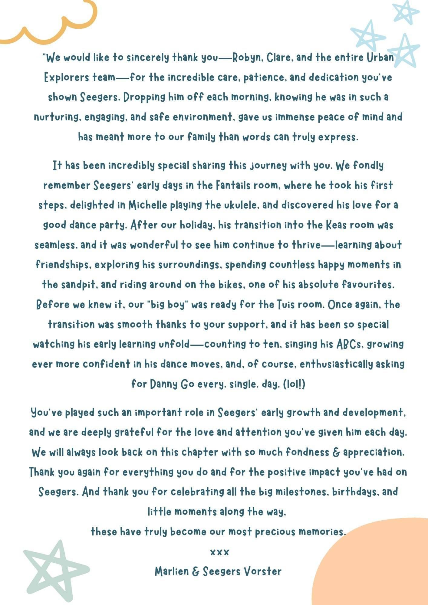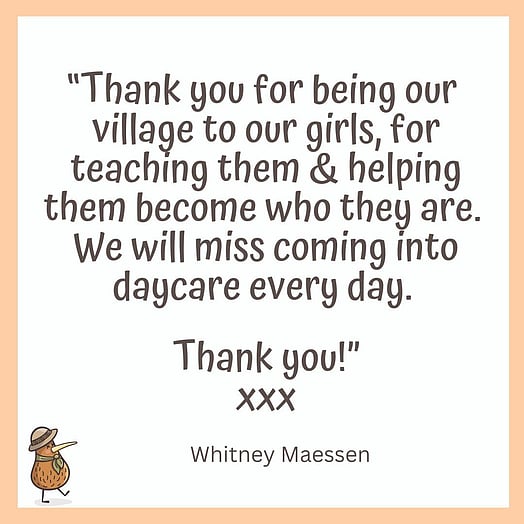 As parents, we truly valued and appreciated the personal touch that you provided. Being greeted by name and having regular discussions about Sam's developments were not just part of a curriculum but a genuine part of the everyday interactions. This personalised approach is something we value because, in our opinion, daycare is the foundation for many of life's learning opportunities. The relationship a child builds with their learning institution during this crucial phase plays a vital role in shaping their lifelong approach to knowledge, learning, and development. To be included on this journey even when not there to see it is gold.