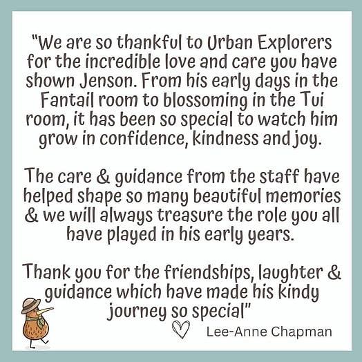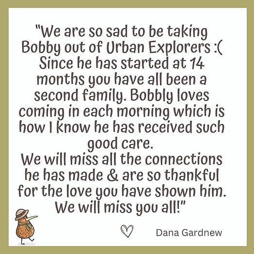 Thank you for being such an integral part of Sam's formative years and for fostering an environment where diversity is celebrated and embraced. Your dedication, care, and professionalism have made a significant impact on his life, and for that, we are truly grateful. We will carry with us fond memories of his time at Urban Explorers, and we hope he can take the values and lessons he learned here with him as he steps into the world of formal education.